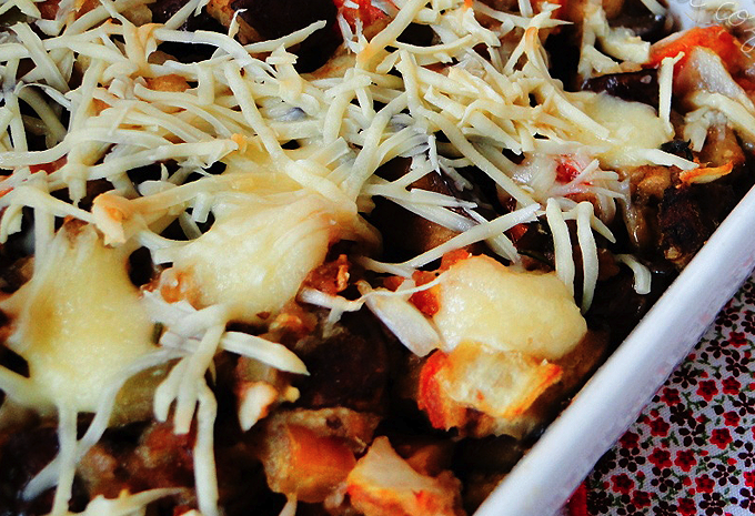 Recheie as berinjelas, polvilhe com a ricota e por último com os tomates.