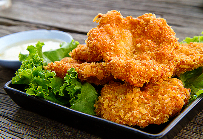 3. Empane os filés de frango com a mistura de manteiga e milho, apertando com as mãos para que a casquinha fique uniforme.