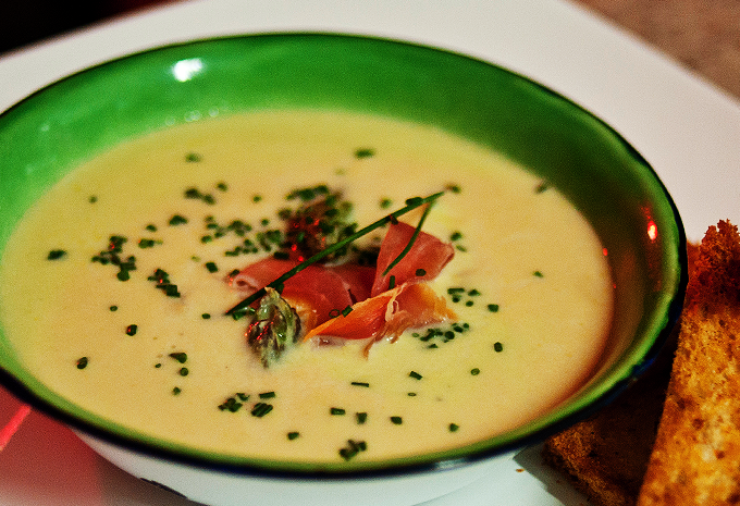 Em uma panela, aqueça o óleo, doure o alho e a cebola. Junte os aspargos, o caldo de legumes, o amido de milho e a água fervente. Sempre mexendo, cozinhe por 10 minutos. Espere esfriar.